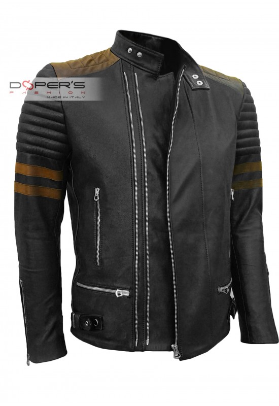 The Kim Raider leather jacket is a men's jacket in perfect biker or rider style, hence the name. This captivating motorcycle-style model is characterized by many details, including: double off-center zipper on the front, extra zippers on the sides in addition to the pockets, suede-effect leather bands on the arms and shoulders, quilted padding on the shoulders, and side bands with buttons.
