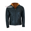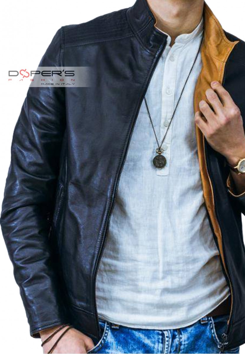 The Kevin jacket is a genuine leather jacket for men with soft lines and a comfortable fit, slightly more snug around the hips. The distinctive feature of the Kevin jacket is the beautiful high leather collar that can be closed with the main central zipper. Additionally, the jacket's interior is a bright and lively ochre yellow, almost a leather-orange color, contrasting with the more classic and dark black color visible on the outside of the leather jacket.